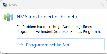 Beim Start des NM5 SV erscheint bei uns die Anzeige "NM5 funktioniert nicht mehr" (Siehe Anhang) direkt beim Start. Nach dem einzigen möglichen Klick auf "Programm schließen" startet das Programm ordnungsgemäß.